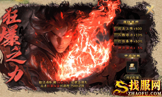 狂暴之力礼包:消耗5000灵符开启,赠送攻击上限加500、体力加10%、打怪暴率加50%、神力倍攻加5%。除了活动以外,只要被玩家击杀,状态就会消失,同时击杀者可以获得2500个灵符。