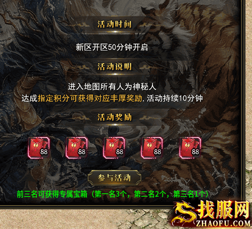 龙争虎斗活动:新区刚开区50分钟后开启,玩家进入地图后所有人都将成为神秘人,达成指定积分可获得相应丰厚奖励,活动持续10分钟,前3名可获得专属宝箱,第一名3个,第二名2个,第三名1个,还有5个88元充值红包奖励等你来拿。